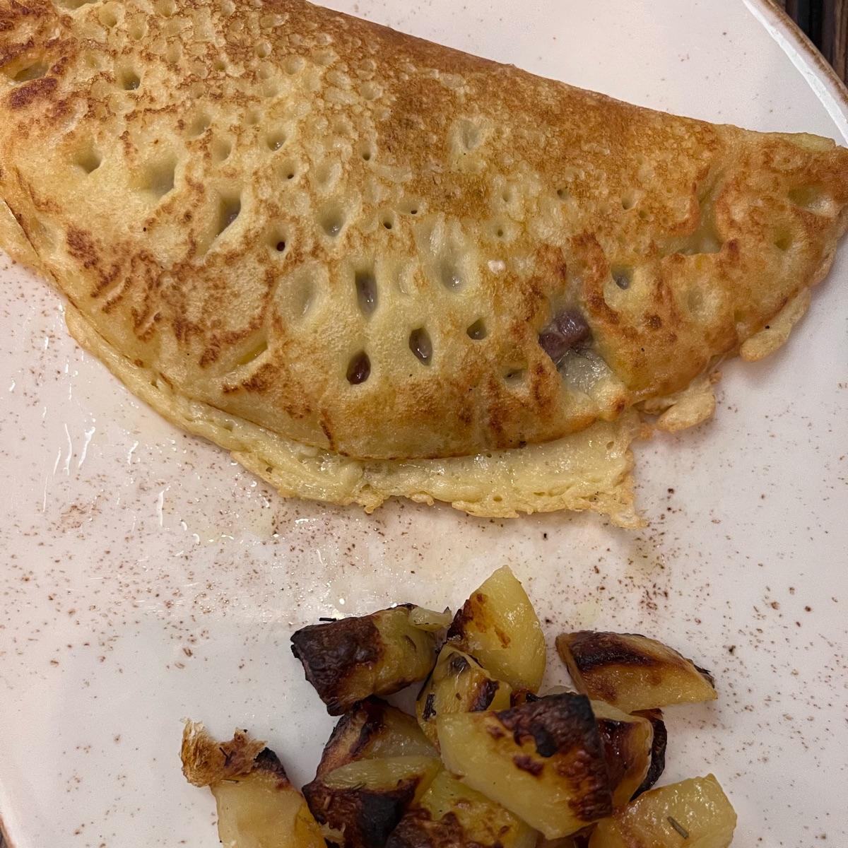 The chickpea omelette is thick and spongy, moist, filled with creamy cheese and vegan prosciutto. Super tasty and delicious.