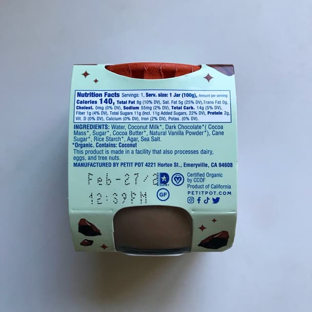 Petit Pot has done a lovely job with their plant-based puddings — they’re dreamily smooth, with a light, whipped texture and rich dark chocolate flavor. One of my non-vegan family members commented that it seemed a bit too slippery, though it also exceeded her expectations. One step at a time!
