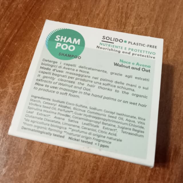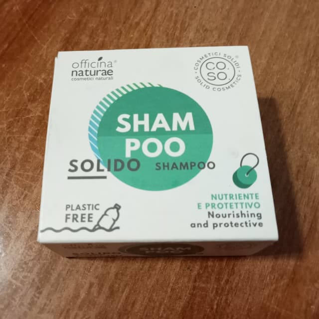 Shampoo solido Officina naturae. È venduto in una confezione #plasticfree, tutta di cartoncino.