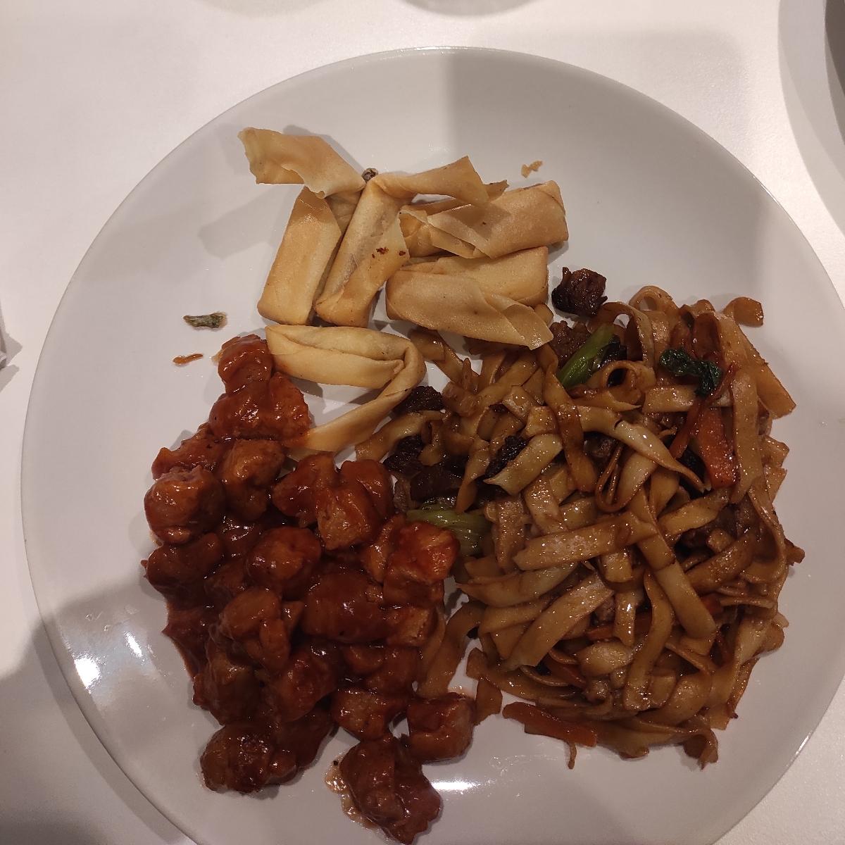 Muy asequible y muy rico. Costó 7€ el plato con bebida incluida.Carne de soja agridulce, rollitos de maíz y tallarines tres delicias