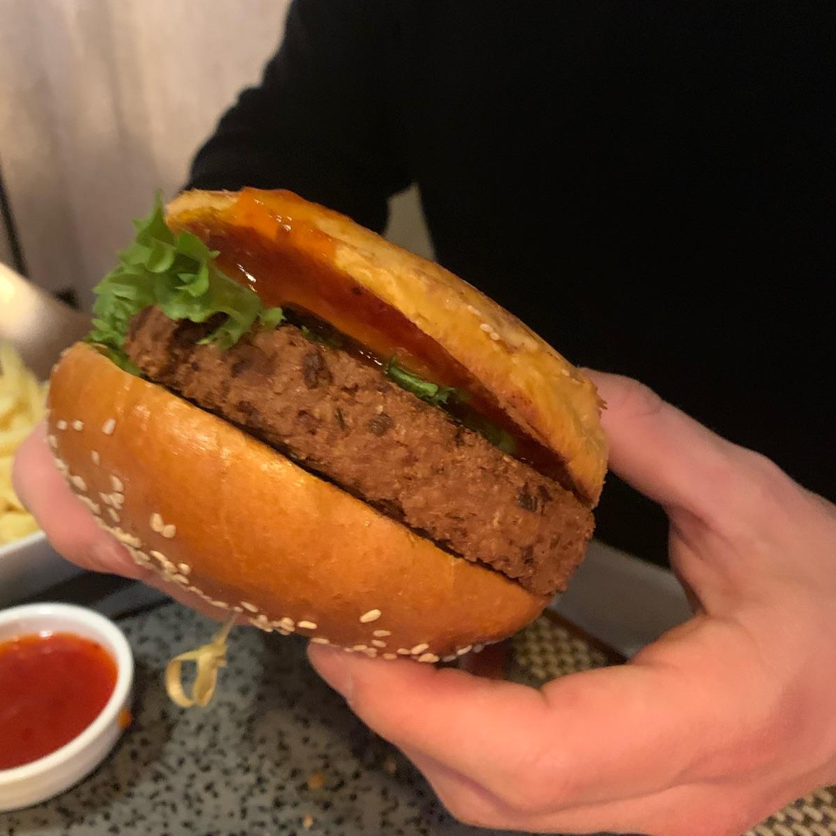 L’hamburger di Tofu e avena, sapore molto buono! Con contorno di patatine fritte!