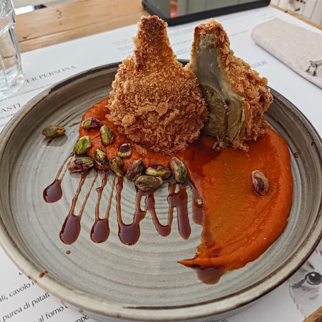 Buonissimo antipasto. Carciofo saporitissimo, panatura 🔝 e crema ai pomodori secchi 🤤