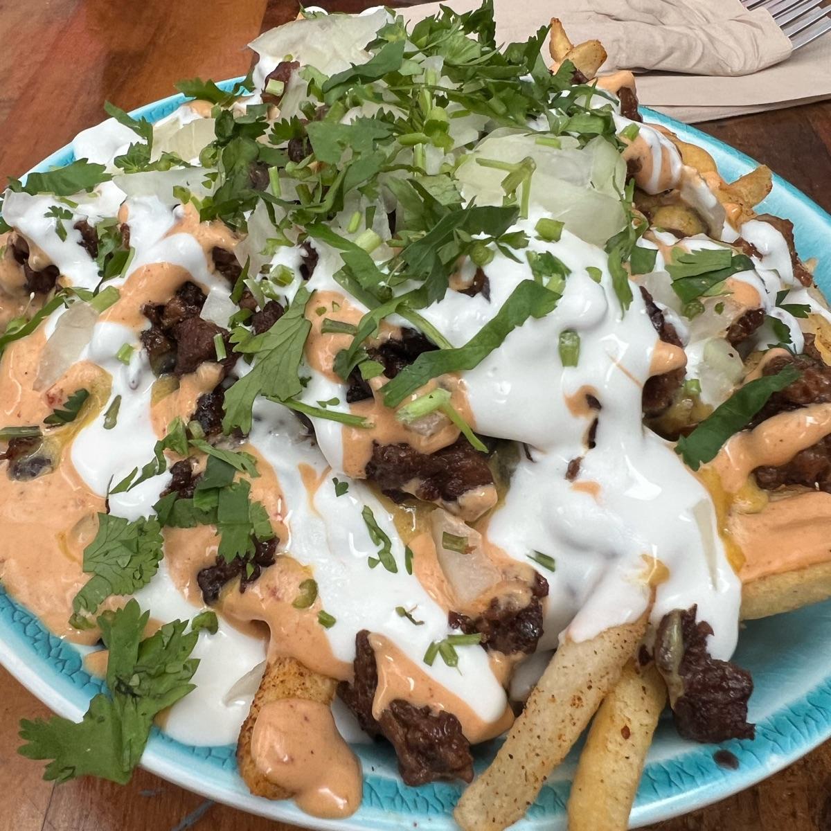 This restaurant in this dish was amazing. Exclamation the loaded fries with the carne asada, the sauce, the cilantro it’s all just so great you can get it as your main meal or you can share it as an appetizer. Either way you can’t go wrong.
