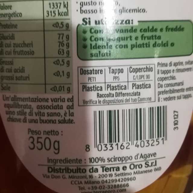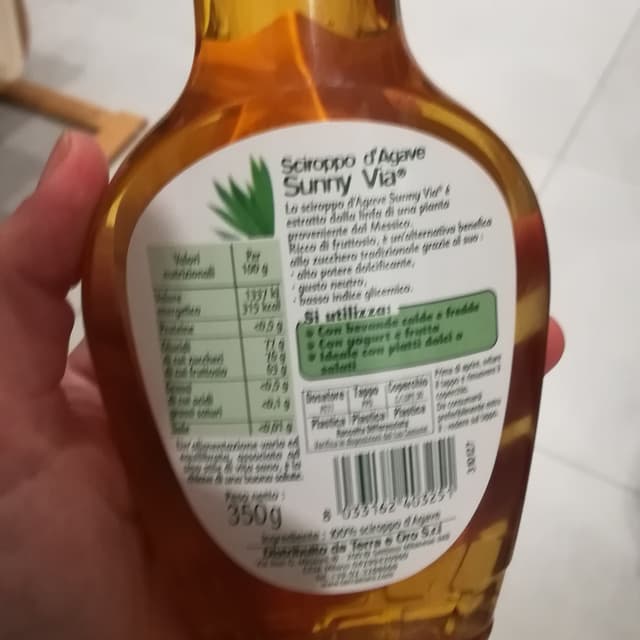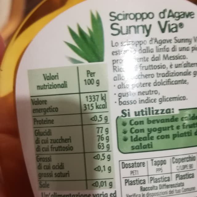Sciroppo zuccherino ottenuto dalle agave messicane. Ricco di fruttosio è adatto per chi non vuole alzare l'indice glicemico in modo repentino. Zuccherato senza alterate il sapore della pietanza. Io lo uso per la colazione