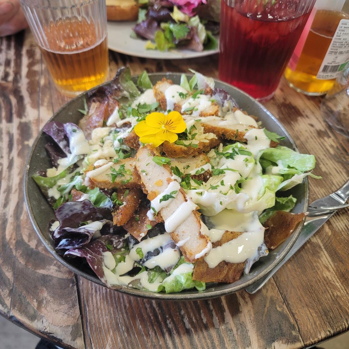 Une salade généreuse à tomber : mélange de salades de saison, sauce Kaesar maison, filets de Chicky panés, croûtons, copeaux de no-Parmesan Gondino, copeaux de no-Bacon maison, persil frais (14€)
