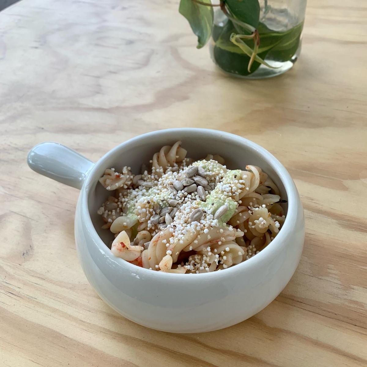 En el menú del día tenían esta pasta fusilli con jitomate, decorada con amaranto, semilla de girasol y su aderezo de la casa que me parece es de cilantro y que le da muy buen sabor. Bastante sencilla pero sabrosa 😋🤤 #veganpasta #abillion #lovevegan
