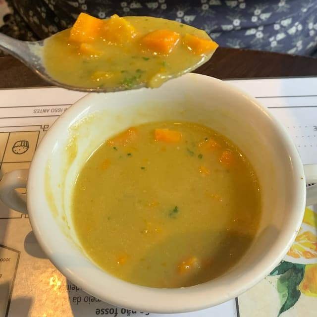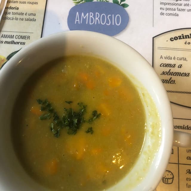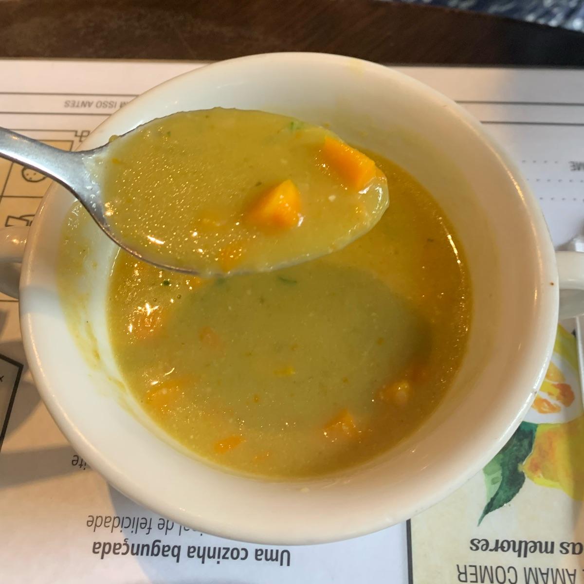 Apesar do dia estar razoavelmente quente, está deliciosa sopa 🥣 de Ervilha com cenoura 🥕cortadinho em cubos, caiu muitíssimo bem 😉😋😋😋
