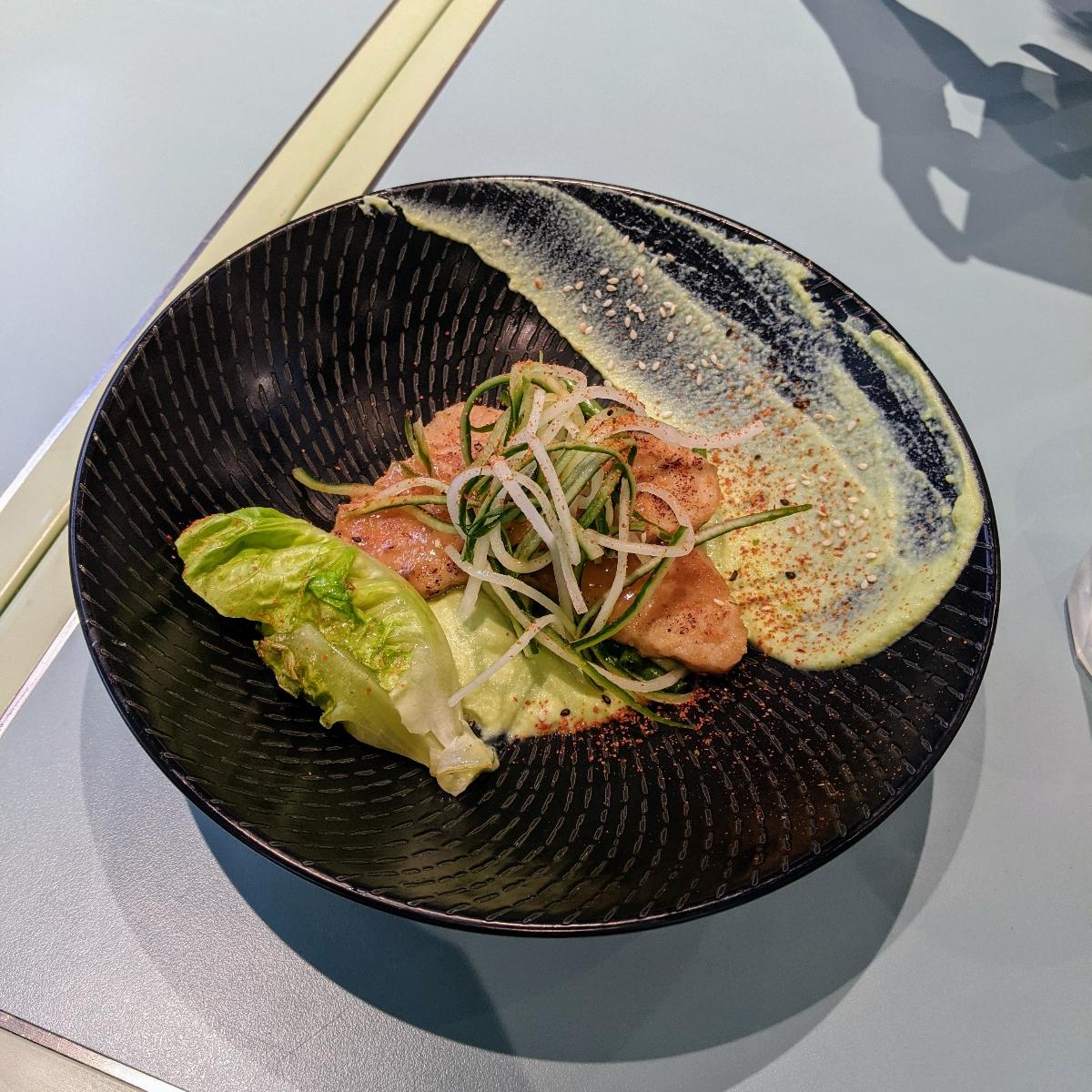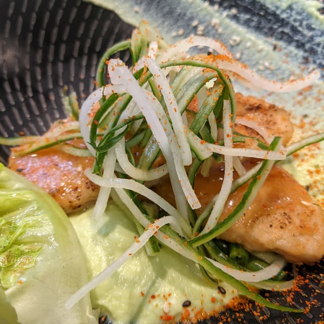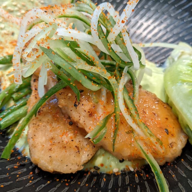I'm obsessed with OmniFoods' vegan fish #fillet 🤩 Perhaps though it's Green Common that just prepares it so well! This is the fourth or so variation of this #veganfish I've tried here 😋 This time, cooked in #miso and laid over a bed of mashed #edamame 🙌 I really thought it was #guacamole at first, but upon checking the menu I knew it was just a little too delicious to be just that 🤭 Paired with the wonderful deco of "telegraphic" #cucumber - per the menu & some grilled romaine lettuce 🥬 my only nit with this dish is that there wasn't enough!