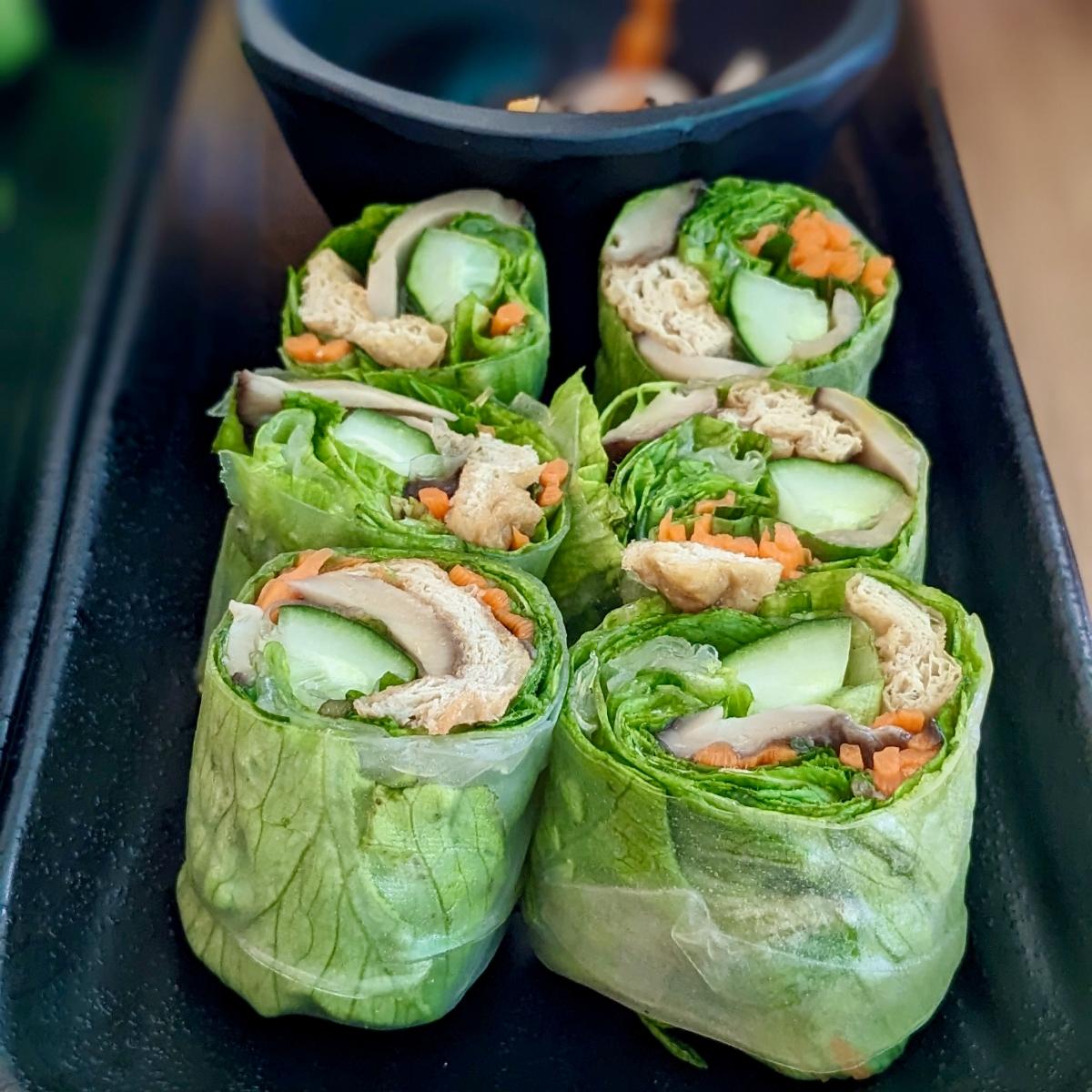 Mushrooms, fried tofu puffs, carrot pickles, and cucumber wrapped in lettuce and rice paper. The low carb version came without vermicelli. Came with a soy sauce dip; personally would have preferred a peanut sauce dip. Decent if you want something light like before a workout or if you're on a keto diet. Otherwise taste-wise is was nothing exceptional in my opinion, especially since it wasn't cheap. 1 roll consists of 3 pieces; the picture here with 6 pieces is of 2 rolls. (Allium-free option, $7.90 / roll) #sgvegan