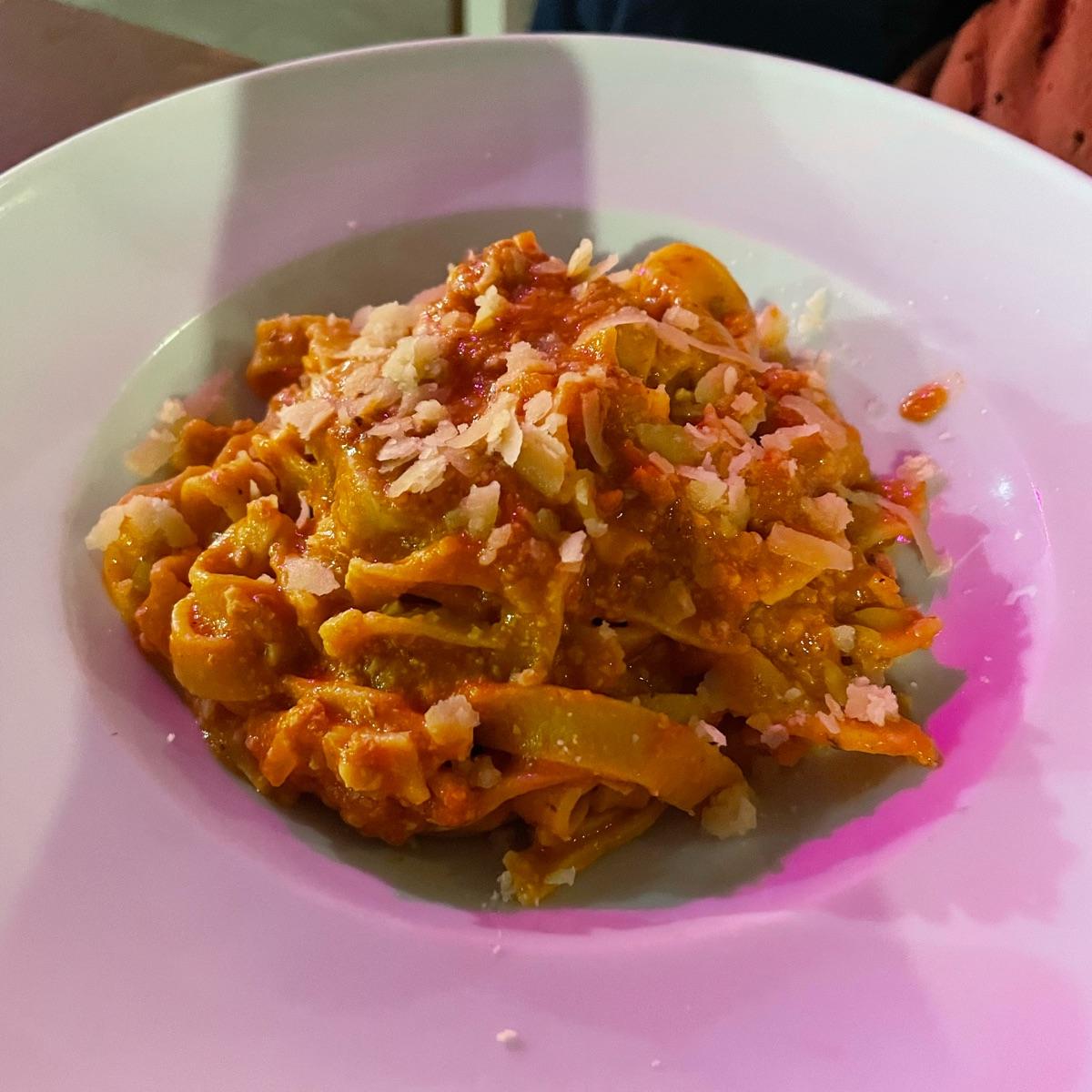 Ottimo piatto di tagliatelle al ragù di soia, porzione abbondante, cottura giusta, ben condite!