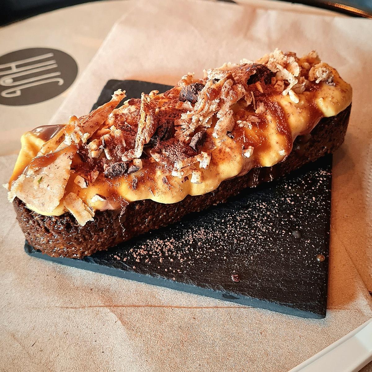 I dolci di Hug sono sempre eccezionali! Non ha niente a che fare con un tiramisu, penso non abbia neanche il caffè, ma è davvero buonissimo. È una frolla di grano saraceno (bio e senza glutine), con sopra crema alla nutella e crema di mascarpone e pasta di mandorle e scaglie di cioccolato.