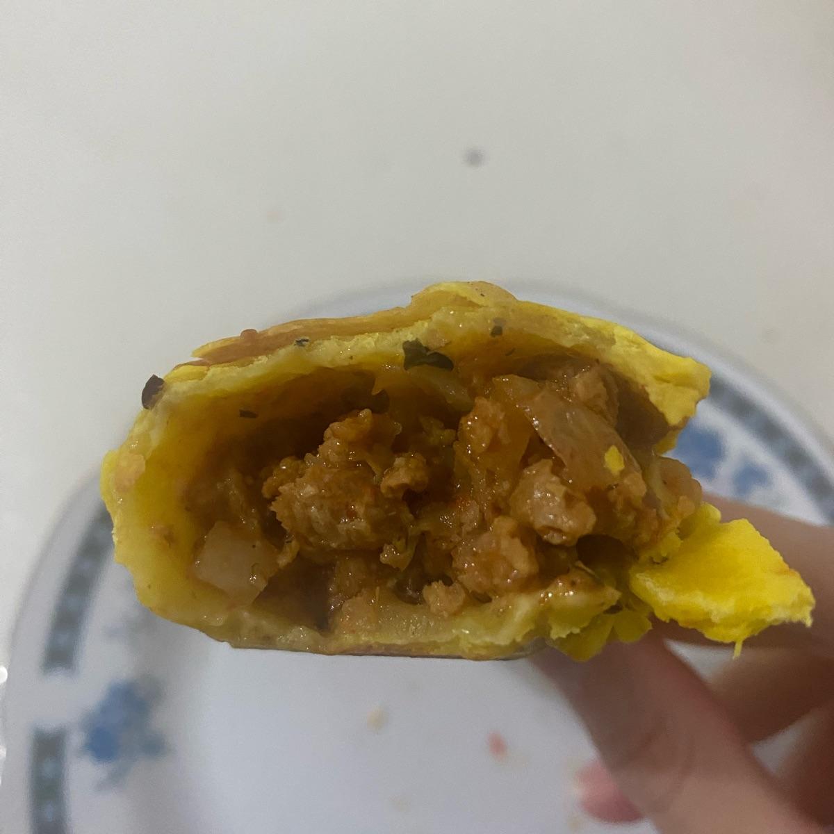 No tiene sabor a pollo pero sí a curry, es rica y la masa muy buena
