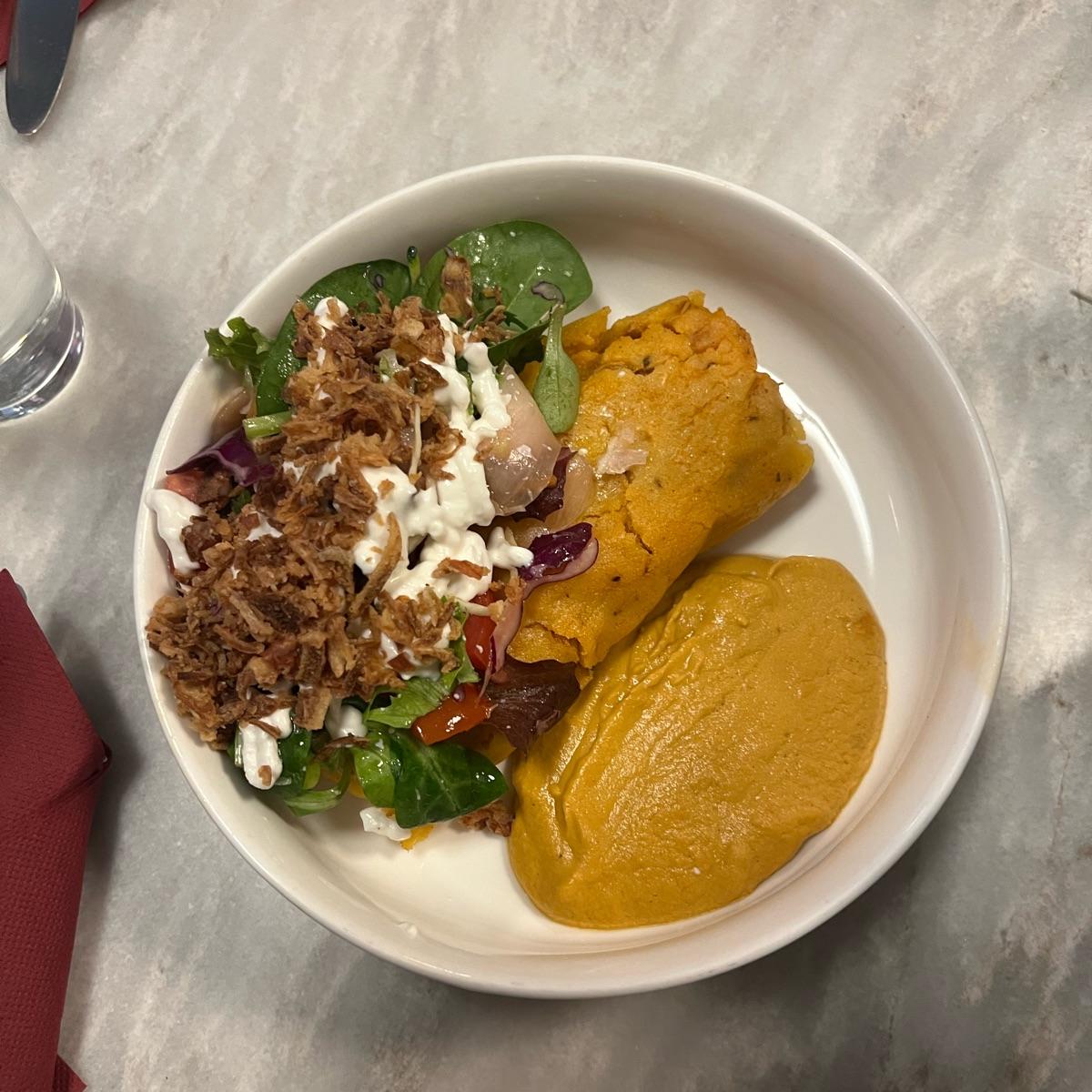 Impasto morbido, ripieno di vegan meat cotto in modalità spezzatino. Crema morbida di cui non ho capito gli ingredienti, insalata accanto un po’ slegata. 14€