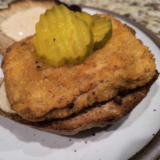 The actual product doesn't look much like the crunchy filet on the package, does it? I didn't have any fresh toppings to use, but I added pickles to mimic the Chick-fil-a experience and also some homemade buffalo ranch sauce. And the sandwich was TASTY. Especially when I got to the bites with the pickle chips. The flavor was nice and the texture was, too.