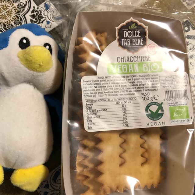 🥐 Chiacchiere vegan bio are organic and vegan treats that are perfect for any occasion. These crispy, sweet treats have a delicious taste that stands on its own, so you don't need to add any extra sugar. Made with organic ingredients, these treats are a guilt-free pleasure that you can enjoy anytime. Try a box of chiacchiere vegan bio today and experience the delightful taste of these irresistible treats! 😋