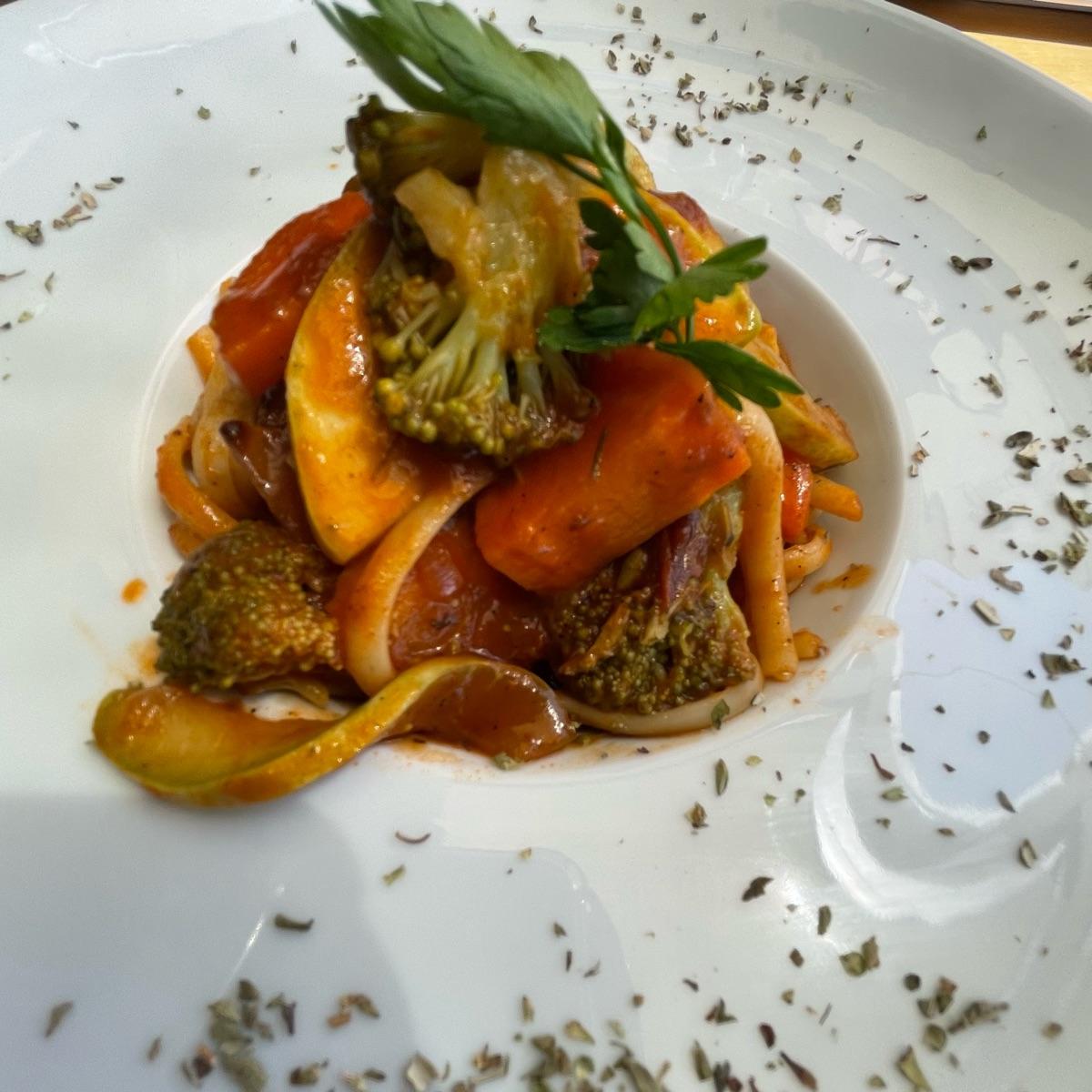 Son fideos con salsa de tomate y vegetales, está muy bien condimentado y llenador. Hay otras opciones en este lugar también