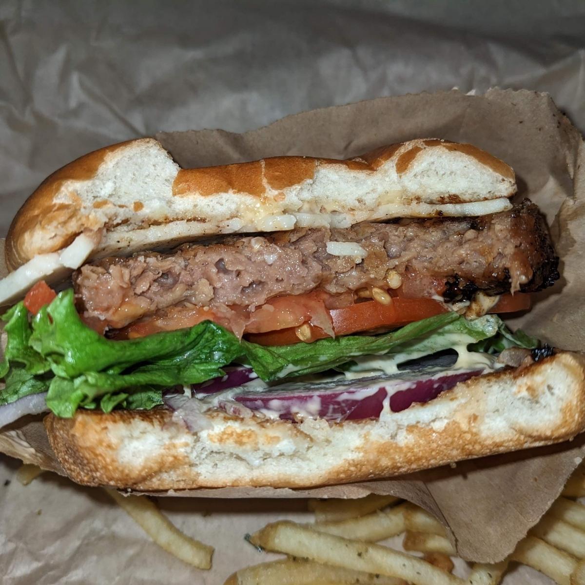 100% vegan! Impossible burger, Vegan aioli, Good Planet cheese and a vegan brioche bun. Plus it is f'n delicious!!!