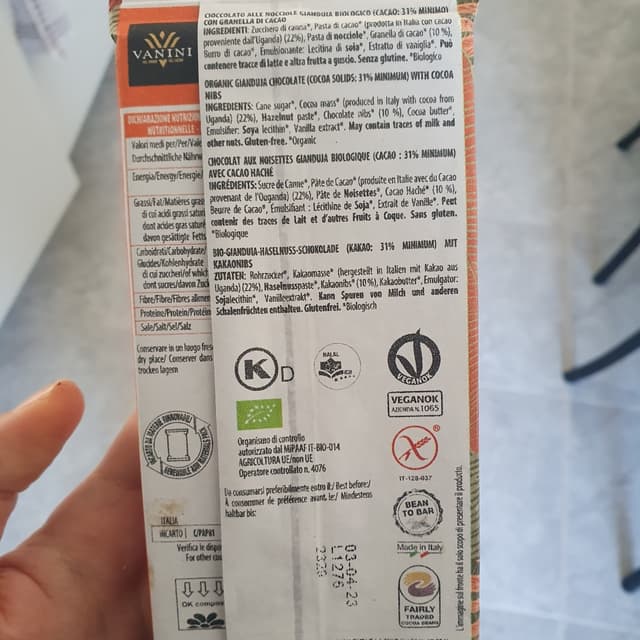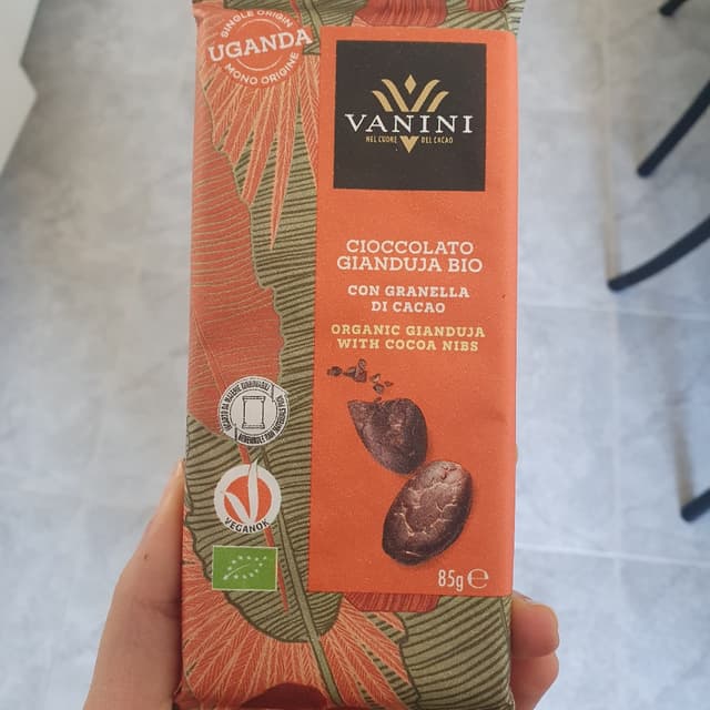 Adoro questa marca di cioccolato sia per il sapore che per l'"etica" aziendale, anche se questa tavoletta personalmente non è tra le mie preferite. Il gianduia non si sente molto, la granella di cacao è invece molto preponderante. Molta apprezzata l'originalità però!