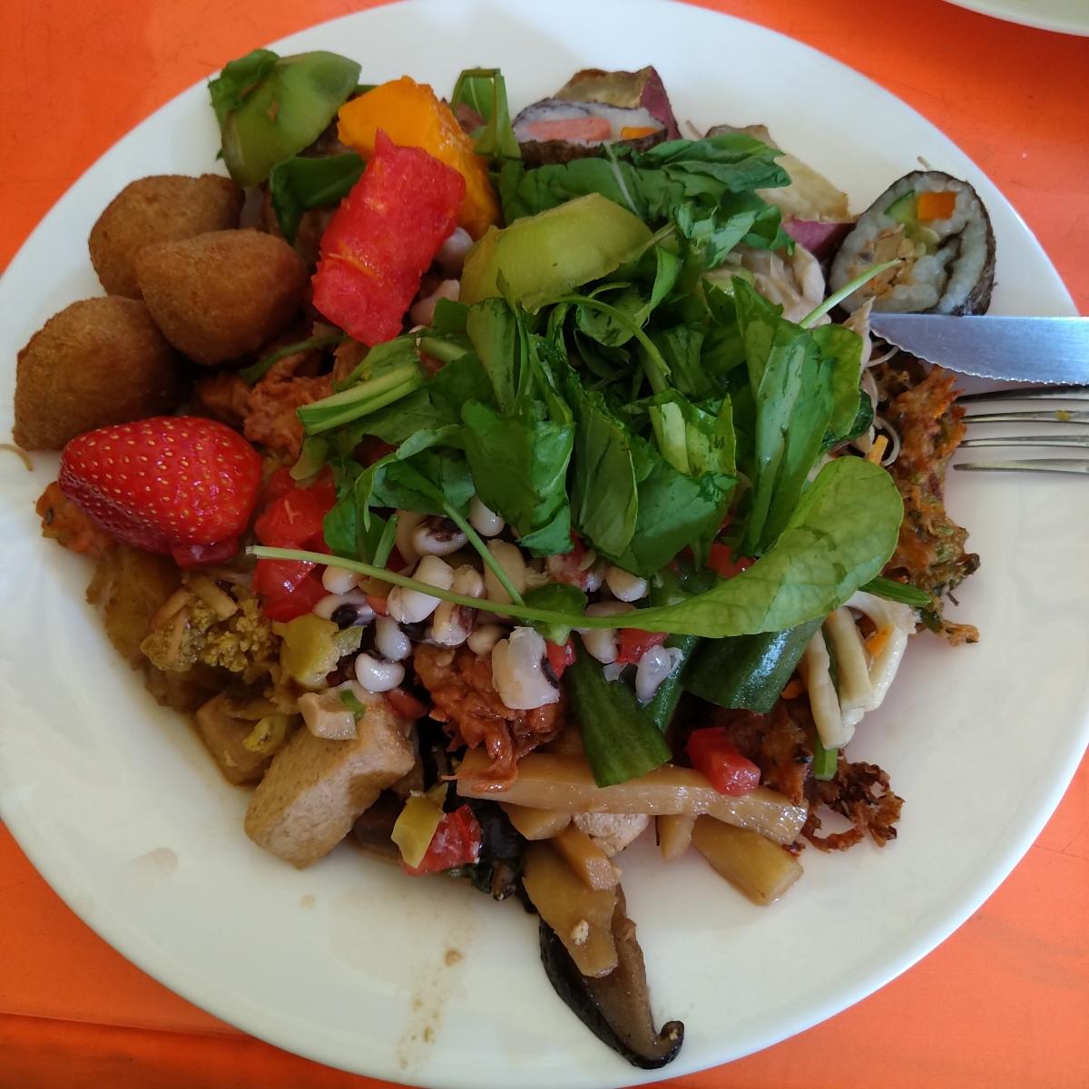 Prato totalmente vegano, com muitas opções deliciosas no buffet
