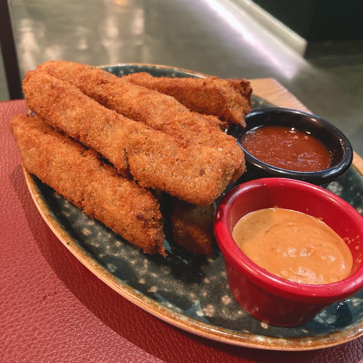 Breaded homemade #seitan sticks served with #chipotle sauce and #ketchup. It was an ok dish but for me not worth 8€.