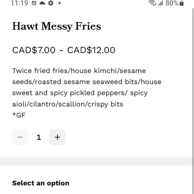 I may start this description off poorly but don't give up on it... I recommend not getting the seaweed on this dish personally I don't think the fishy taste in seaweed goes well with it so I picked it all out after tasting how fishy it was. After picking it out it was one of my favorite dishes I've tried in my recent memory. You have to ordered it veganized but I find it hard to imagine someone disliking this dish after taking off the seaweed. I liked it so much I ordered the exact same thing 2 days in a row and it would have been 3 days in a row if I wasn't worried about making the person I was with eat the same thing 2 out of 3 days in a row. I personally love the banana peppers, sauce, fries and jalapeno's just a fyi there was only a couple of jalapeños in the dish each day I ordered it if your worried about it being too hot/spicy. In my opinion it was a great combination and I imagine I'll be going back there quite soon.