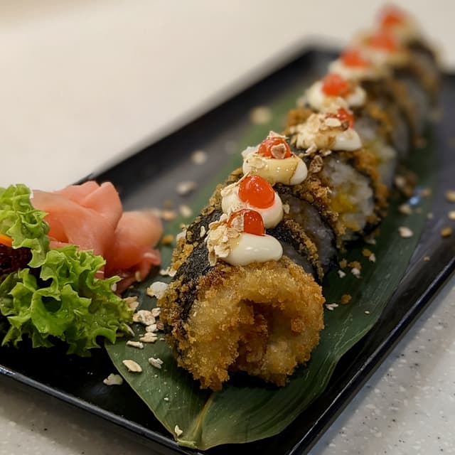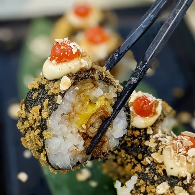 Sushi rolled with juicy mango flesh and soy skin 'chicken', all with a sprinkle of oats and nicely grilled in a manner reminiscent of tzechar cereal dishes. Topped with a dollop of vegan mayonnaise as well as a burst of 'roe' (aesthetically cute but taste-wise sweet with a fruity scent, unlike conventional roe). Would recommend this special roll as it's quite unique! Originally an NDP 2022 special but seemingly now permanent on the menu. (Allium-free, $13.90) #sgvegan #halal