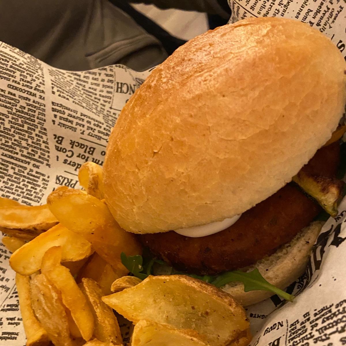 Vegan burger a base di peperone e mais, in un morbido panino, e arricchito con rucola peperoni zucchine alla griglia pomodori secchi e mayo Veg . €11,50