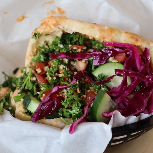 We also tried a #vegan Veggie Pita. Meaning no faux meat, just hummus and fill-ins! We got the sundried tomato hummus, which was fantastic! It has such a nice tomato flavor, and I loved the herbs and spices. I also added lebase cauliflower, which had a great texture and taste. It was fried, so it's not super healthy, but it does have turmeric, which is good for inflammation? Give and take a bit, right?!🤣 I also filled the pita with tabouleh salad, cabbage, cucumber, and lettuce. The real show stopper was the Spanish eggplant! It was smoky, creamy, and even tangy. It was saucy and had garlic, vinegarette, and olive oil. It was delicious! Some of the pieces were a bit big, so it made the texture a little funny, but the majority of it was fantastic. It was really unique, and I would have never thought to add that to a sandwich. This very large pita was just under $10, and I love how colorful and pretty it is. #hummuslover #veganfortheanimals #abillionlove