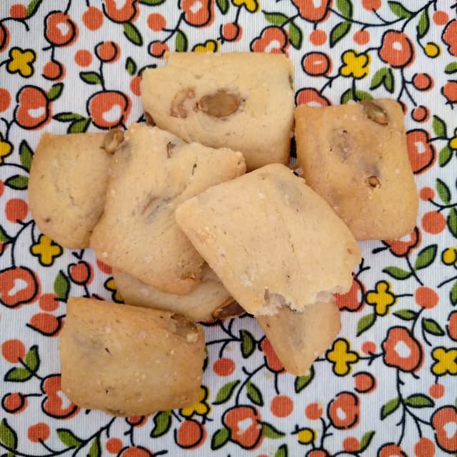 Snack de panes especiales con semillas de calabaza. Son crujientes y tienes granos de sal gruesa en la cobertura. Creo que son horneados. Son barritas de panecillos que parecen estar troceados en partes iguales a mano o con algún tipo de maquinaria que no deja los cortes rectos, para dar rusticidad.