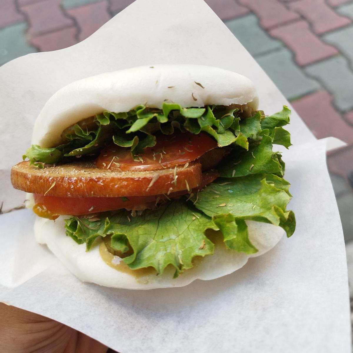 Rice bao steamed sandwich bun filled with fresh vegetables (tomato, gurkin etc) and a patty. 4 types of vegan ones for 60 dollars each.