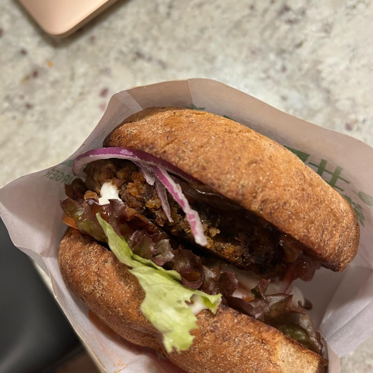 Delicious! I love that this is a hearty quinoa mushroom patty. It’s hard to find a unique vegan burger that’s not beyond/impossible! This was also massive!! Definitely recommend #veganburger #veganjunkfood