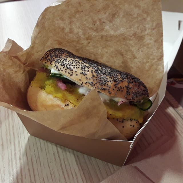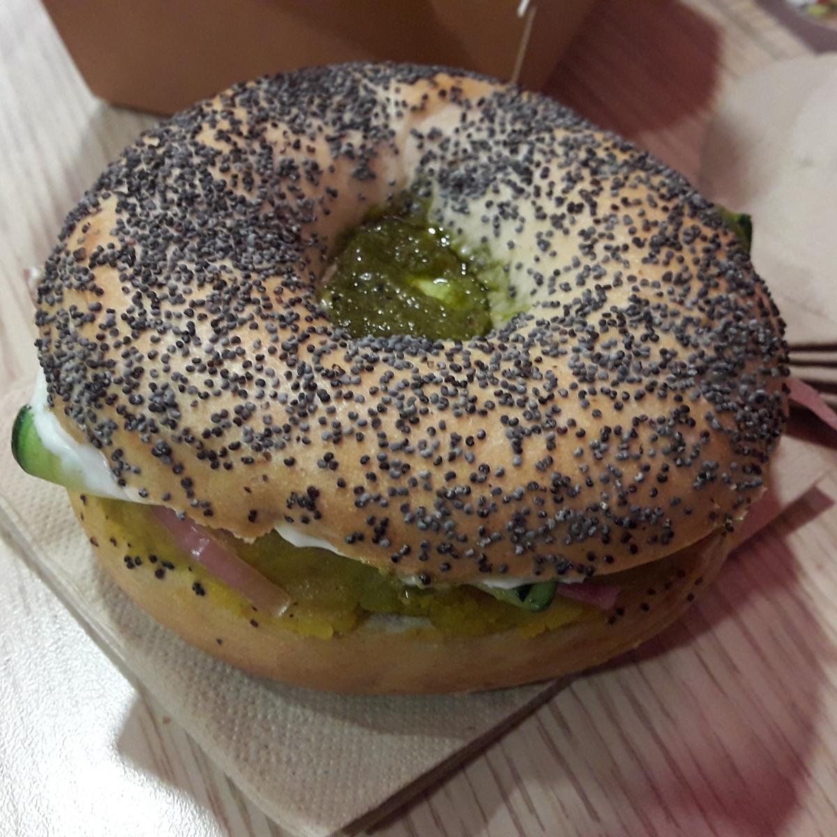 Bagel relleno muy fresco, ds como una ensalada caliente entre pan y pan. Patatas especiadas, cebolla encurtida, carpaccio de calabacín y chutney de cilantro con veganesa