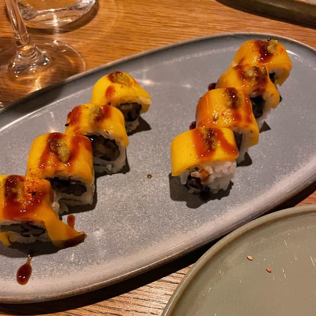 Uramaki con melanzane marinate, mango, salsina piccante ed agrumata e jalapeños.