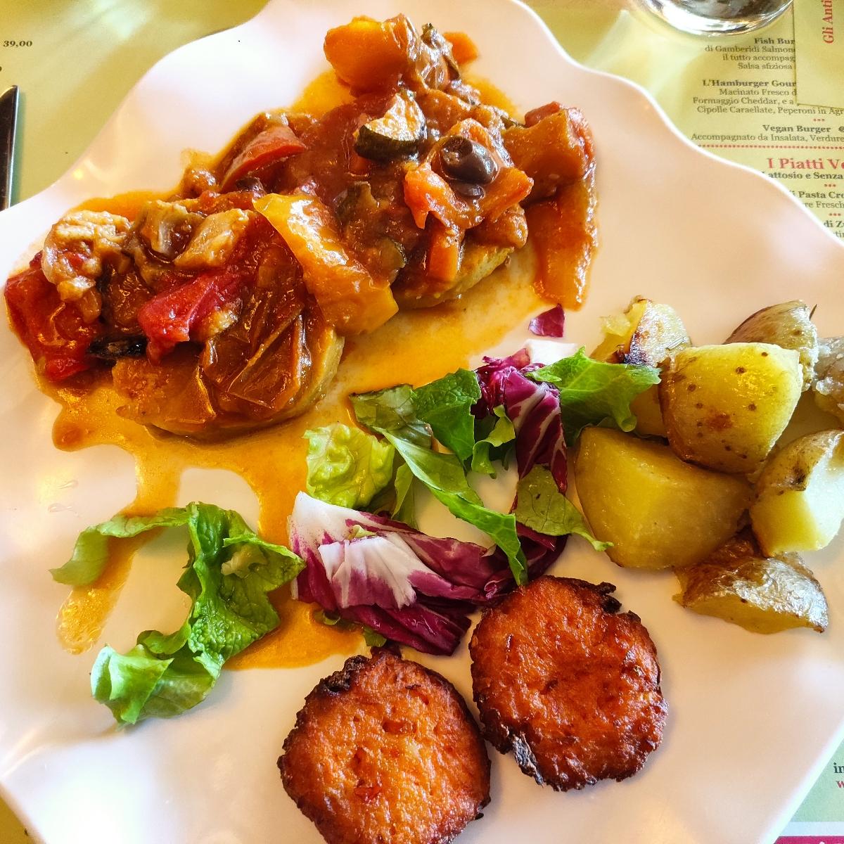 Un bel piatto composto da scaloppine di legumi, patate morbide, insalata, falafel di carote... Buono, ma le scaloppine andavano cotte 🤣 e 20€ a occhio, mi sembrano tanti!