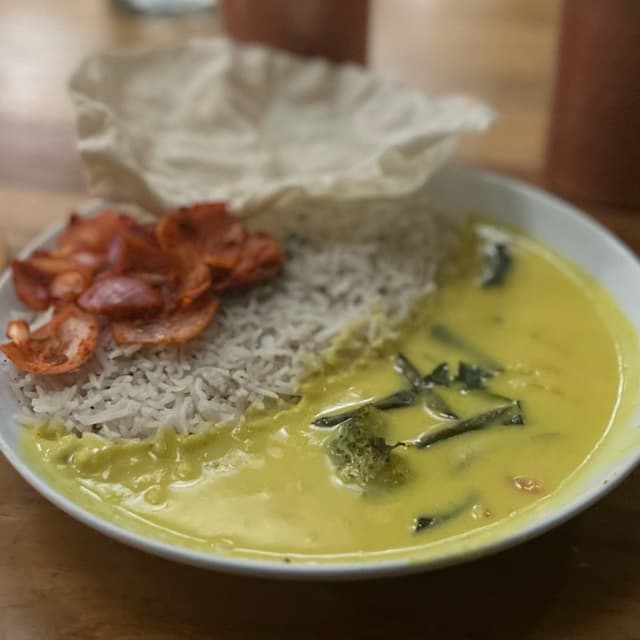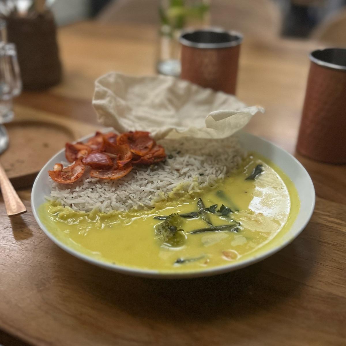 Veggies including broccoli, carrot and beans in raw mango coconut curry served with coconut rice, laccha onion and papad.