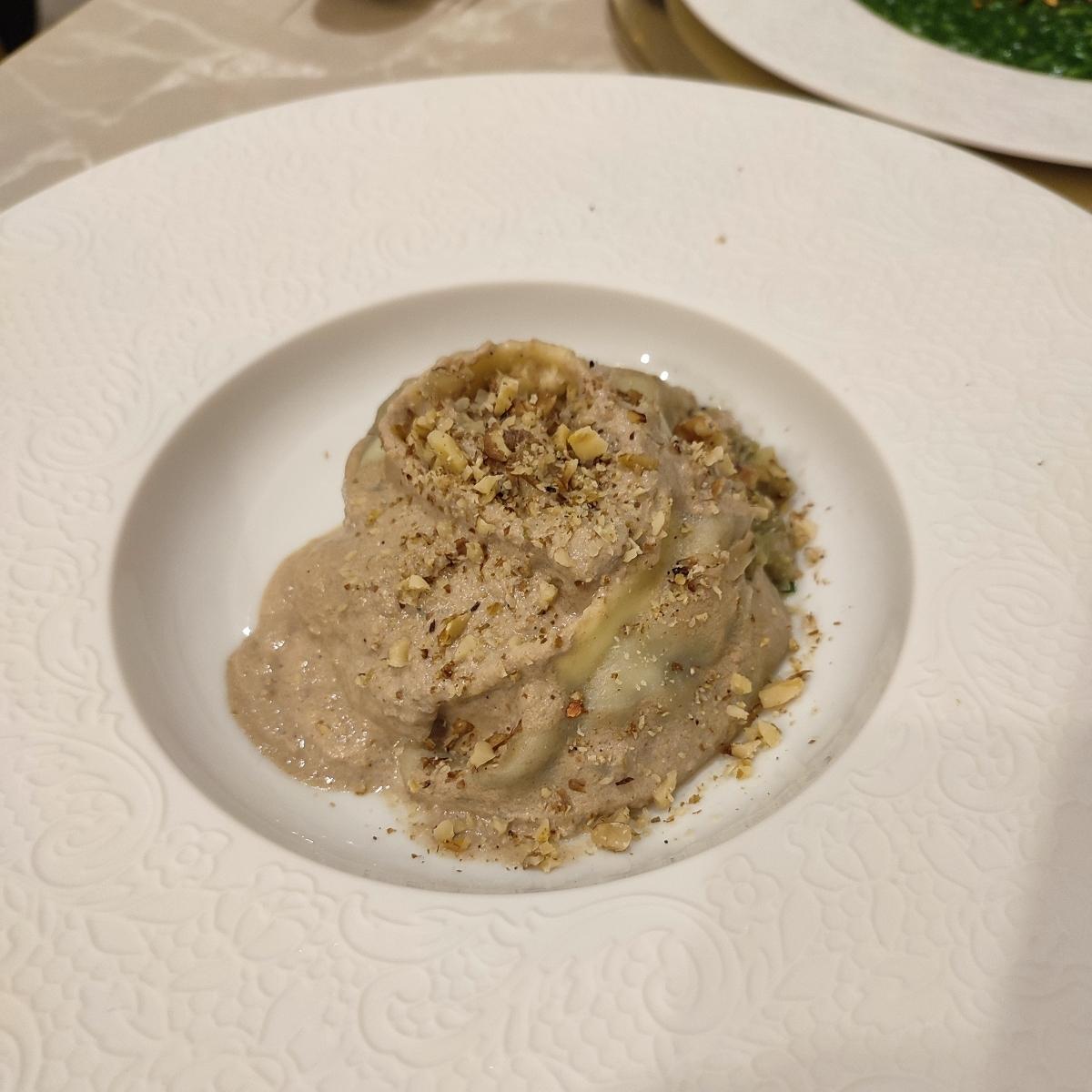 Pasta fresca ripiena di carciofi e maggiorana, condita con crema di noci e formaggio vegetale. Dalla descrizione pensavo fossero ravioli invece è una bisciona di pasta fresca ripiena e arrotolata su se stessa, un'idea molto originale! Amo i carciofi e le noci e la maggiorana mi ricorda i piatti che cucinava mia nonna, quindi mi è piaciuto molto. Al mio ragazzo così così perché per lui i sapori erano un po' spenti e "casalinghi", forse in effetti nemmeno io lo prenderei una seconda volta ma l'ho assaggiato volentieri. Costo 15 euro.