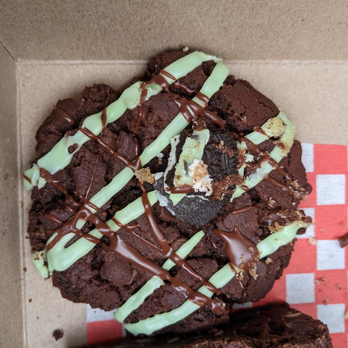 Soft on the inside, crispy on the outside. Full of chocolate chunks and drizzled with mint icing. Really tasty!