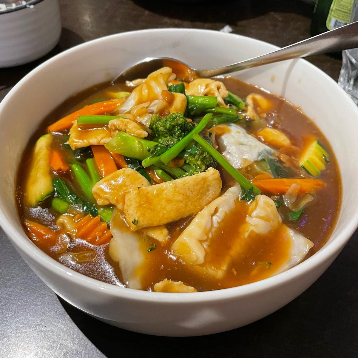 My first time trying rad na - a Thai dish of flat rice noodles with tofu or meat in a thick “gravy”.