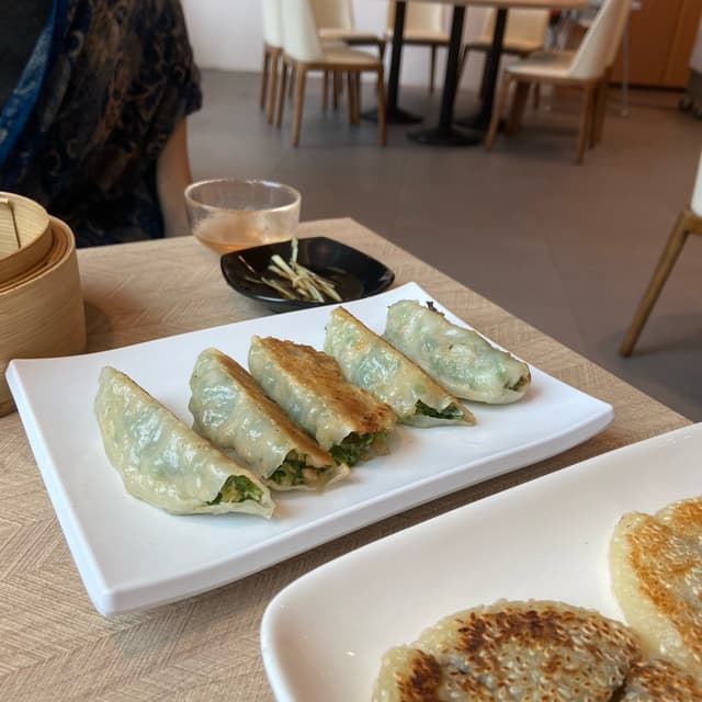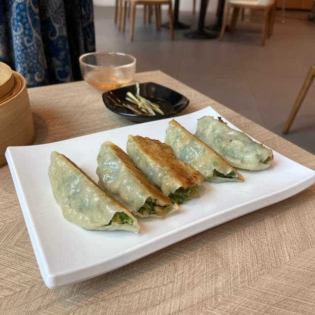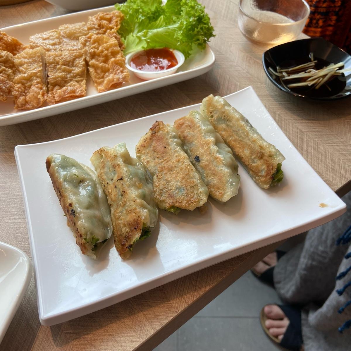 The bottom may look #crispy but they still were some ultra chewy #potstickers 🥟 I didn’t even have half the mind to do a cross-section of these #dumplings when I ate them but I recall #fakemeat and #chives though @m1tch9i adds that she recalls some “slightly cilantro” herb in there that were also present in the jade dumplings, so just a heads up for the #betterwithoutcoriander folks 🤷♀️ I think they were alright!