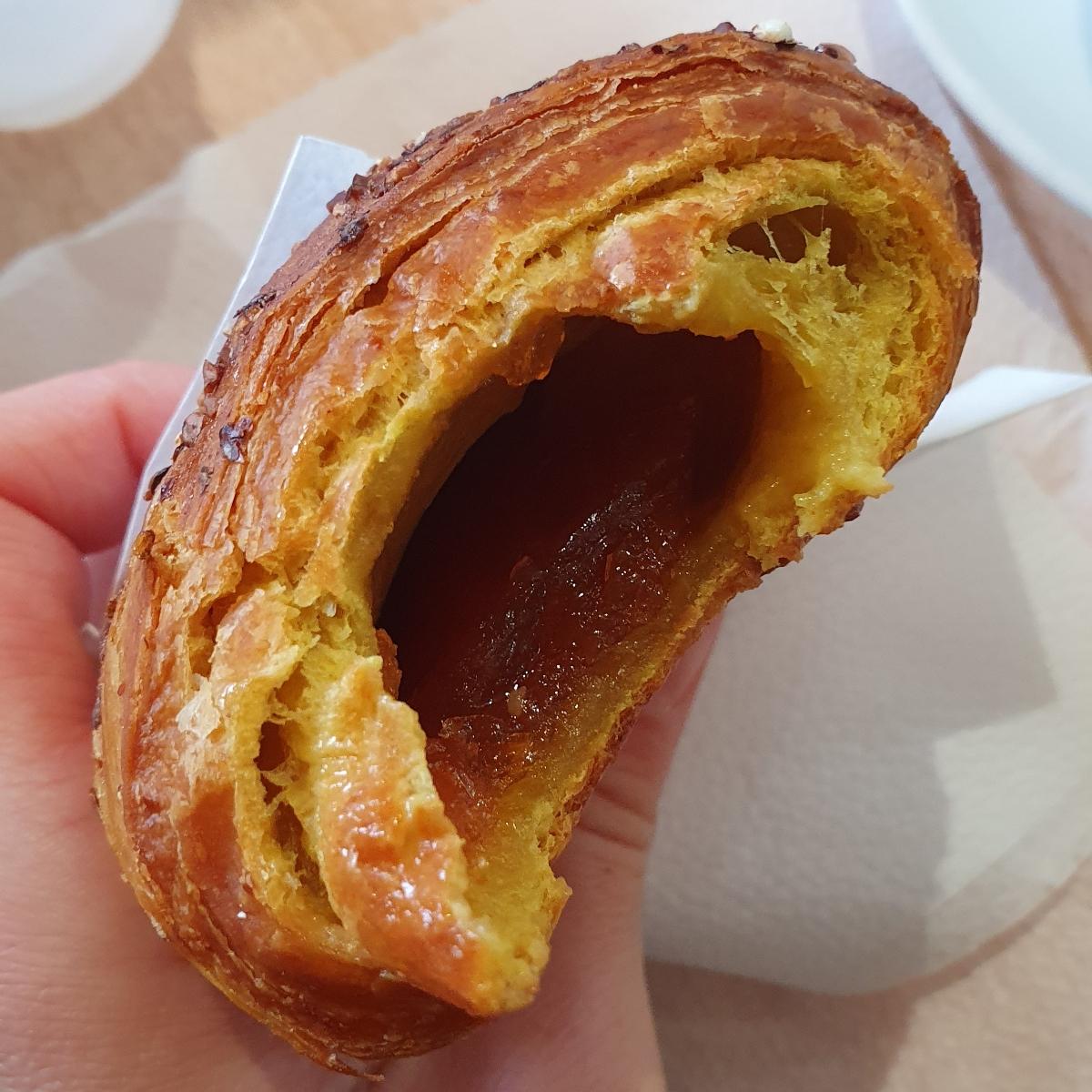 In questo bar gelateria ci sono svariati gusti di croissant vegani, tutti molto originali, tra cui scegliere. Questo per la precisione mi pare fosse con avocado e pompelmo (quest'ultimo lo ricordo con certezza). Molto buono, ma forse un po' troppo soffice, io preferisco quando all'esterno sono un po' più friabili.