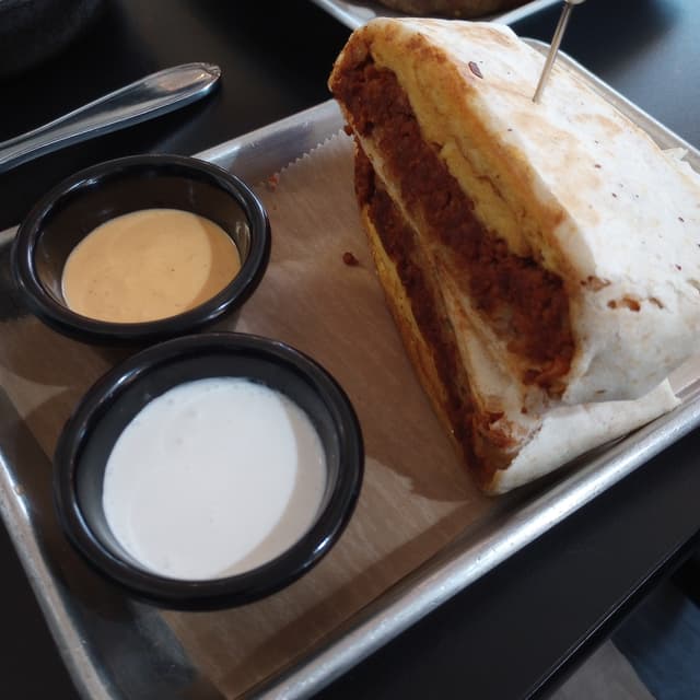 Delicious breakfast crunch wrap with spicy chorizo, just egg, hash brown, and cheese. The chipotle aioli on the side was amazing. Only thing is I wish there was a bit more sauce and/or cheese on the vrunchwrap itself, was just a tiny bit dry. But taste was good!