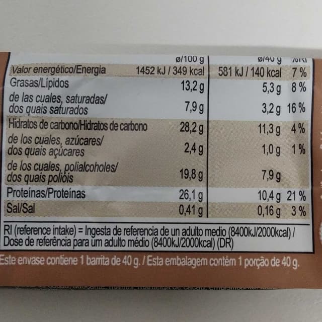 Barrita alta en proteínas sabor a brownie. La verdad es que es una buena opción para picar algo si vas de excursión o algo, mucho más saludable que otras que llevan mucho azúcar.