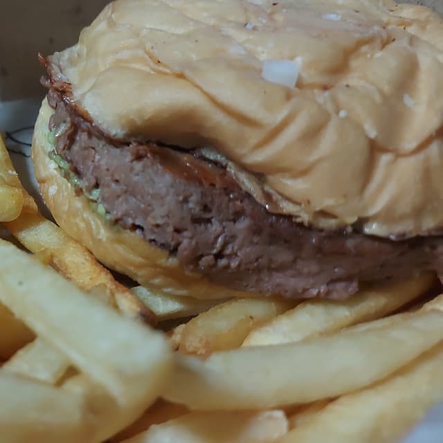 Tiene medallón simil carne notco, queso chedar vegano, guacamoles, nachos, salsa picante, verdeo. Las papas acompañan muy bien.