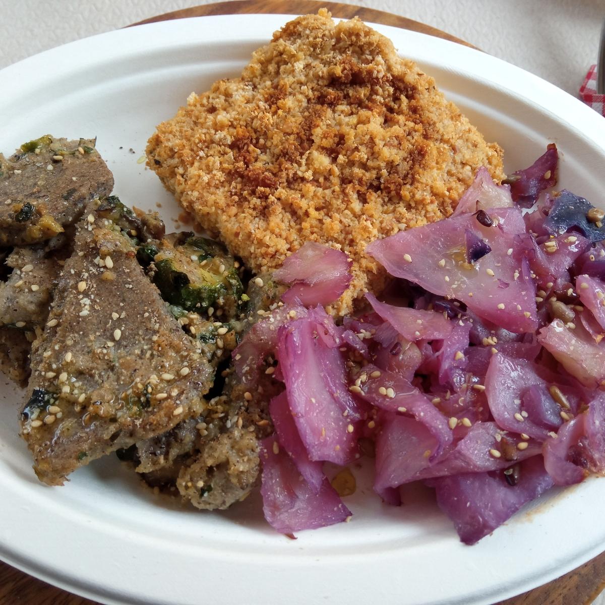 Nel mio piatto ho scelto: testaroli zucchine e funghi, cotoletta di tofu, cavolo cappuccio viola con semi di girasole.