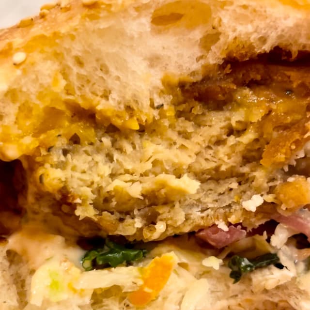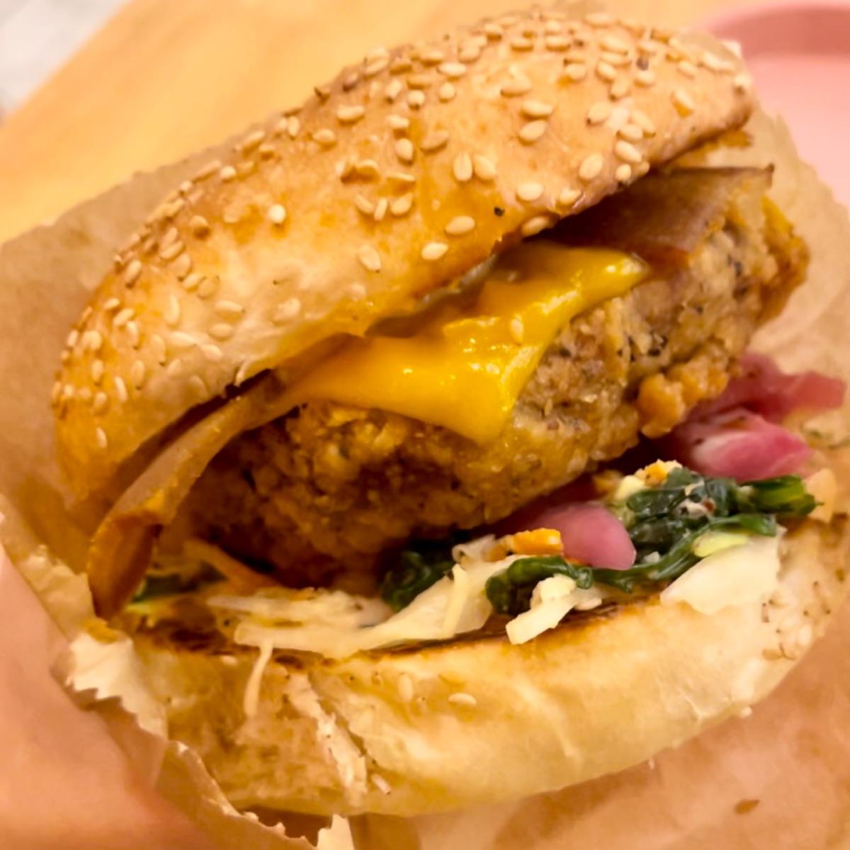 Fried Chik’n, bacon, cheese, creamy slaw, pickled red onion, mondo sauce, sesame seed bun.