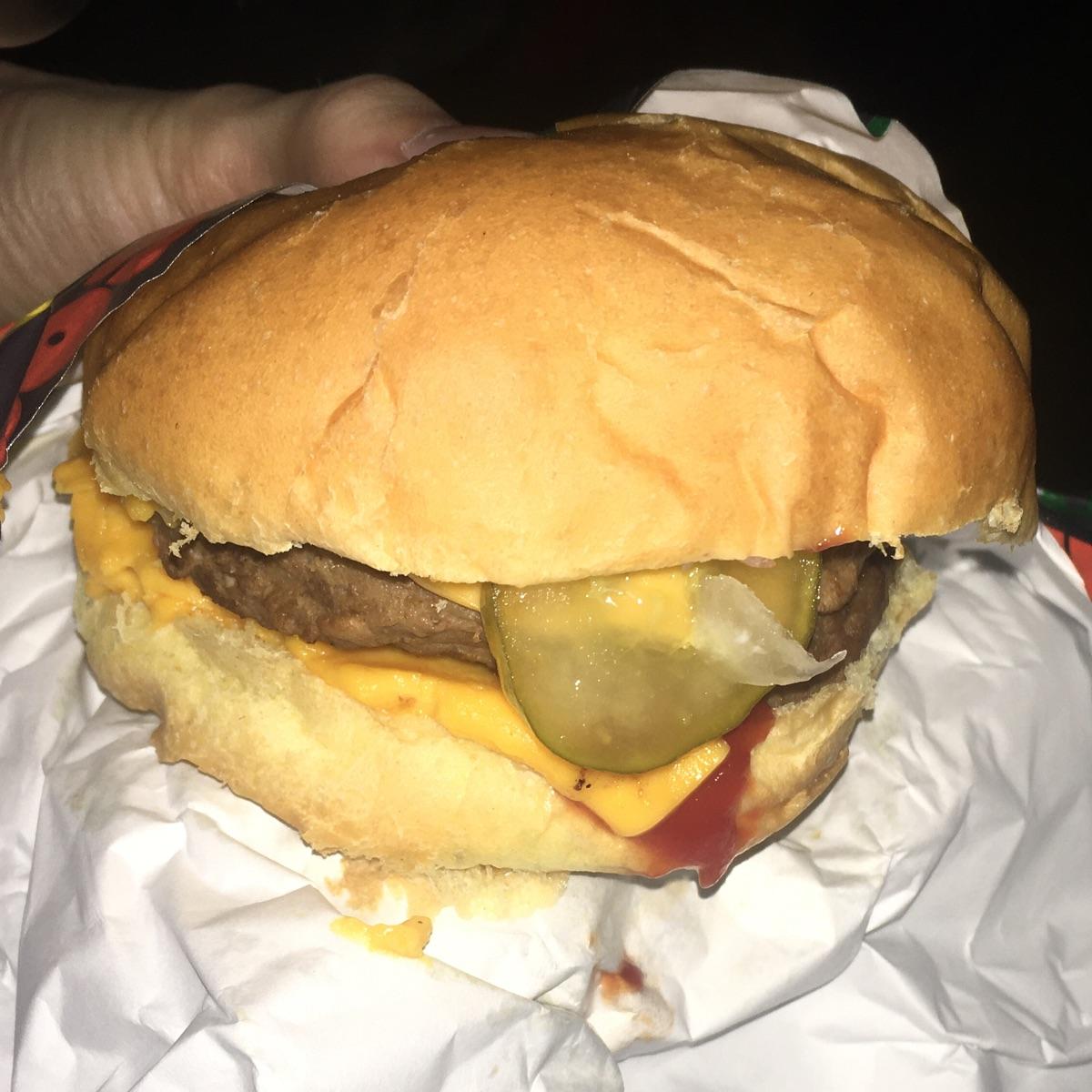 Está bien, pero le falta algo que la haga más fresca. Trae doble medallón, cheddar, pepinillos y cebolla.