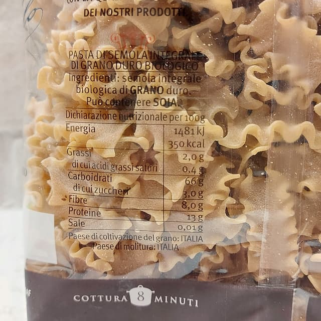 Ottima pasta integrale e biologica da grano italiano. Buona la consistenza, pronta in soli 8 minuti di cottura. Unica pecca: la confezione in plastica, che preferirei più ecosostenibile.