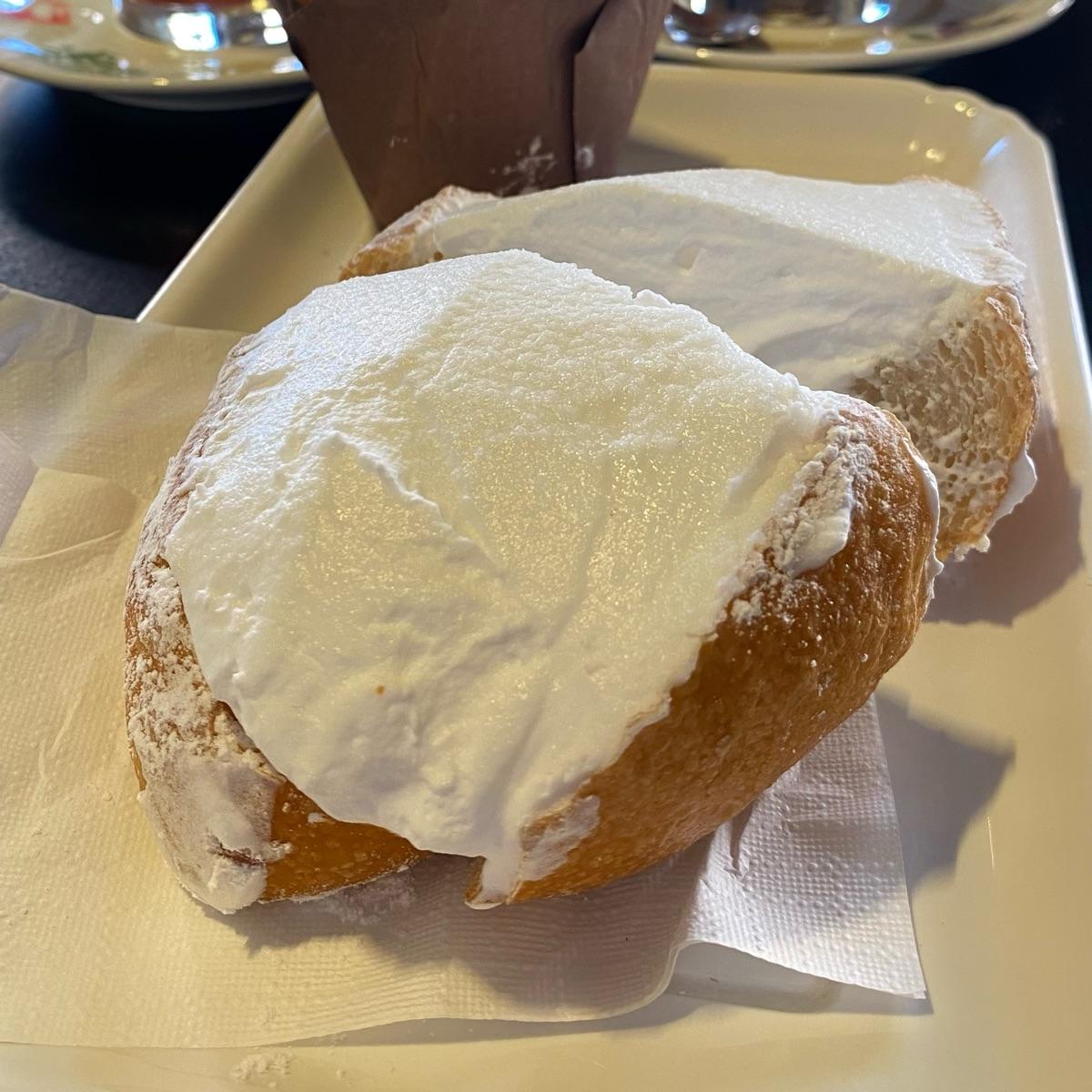 Clamoroso! Maritozzo gigante e strabordante di panna vegetale. Impasto soffice e saporito, leggero. Panna dolce al punto giusto. L’ho amato! Siamo andati per fare una colazione conoscendo la pasticceria, ogni volta che torniamo troviamo scelte vegane in più! Trovare il maritozzo per me è stata una sorpresa stupenda.