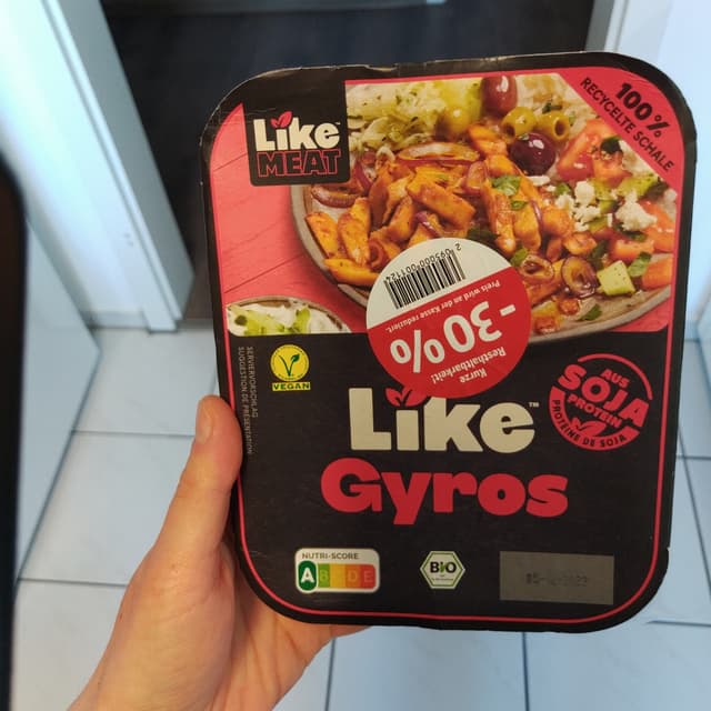 The vegan gyros are easy to fry in the pan. They are large, firm pieces, well seasoned and organic. It goes very well with vegetables, salad and pita bread. We made savoury chickpea pancakes to go with it.