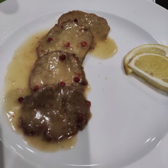 Scaloppine con limone e pepe rosa. Buone ma si poteva spingere di più con i sapori, forse troppo delicate